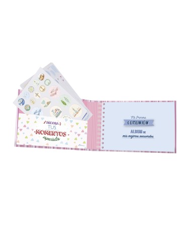 Elegante álbum recuerdos niña cáliz y panes. Tamaño 23 x 15 x 2,5 cm. Tapa dura nuevo acabado tacto seda(soft touch) y detalles en oro. 64 páginas a todo color. 8 hojas con 152 pegatinas decoradas. Elástico color a juego. Encuadernación Wire-o. Hojas para fotos, recordatorios y un acabado de primera calidad.