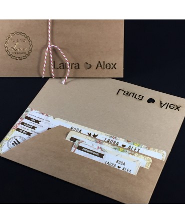 Incluye sobres con forro, lacres, cintas de yute o seda, y tarjetas informativas extra, todo a juego con el estilo Contigo.