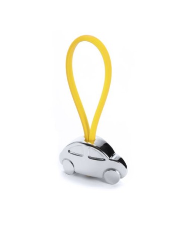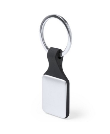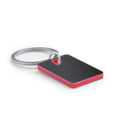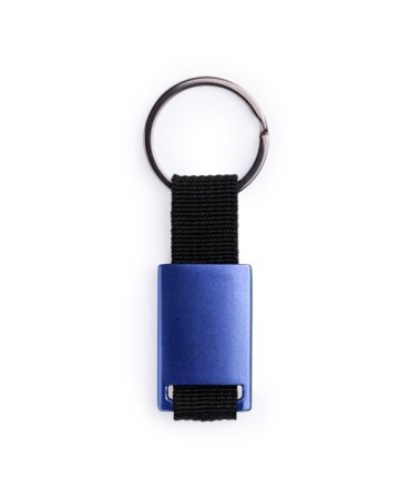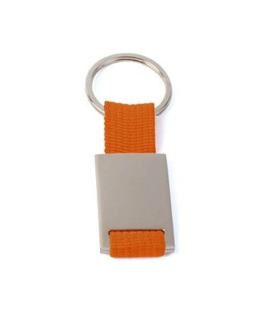 Llavero en metal y poliester en colores rojo, azul, naranja, negro. Medidas 2,8 x 6,5 x 0,4 cm. Min 50 ud.