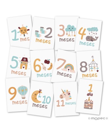 Set 12 tarjetones dibujitos en castellano, 12 meses 15x21cm