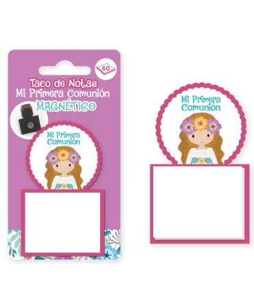 Este taco de notas presenta un diseño temático en tonos rosa, ideal para la comunión de una niña. Gracias a su imán en la parte trasera, se puede colocar fácilmente en la nevera o cualquier superficie metálica.
