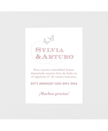 Original tarjeta adicional mariposas como complemento para invitaciones de boda. Medida: 7,5 x 10 cm Impresión: 1 cara Se presenta en planchas pretroqueladas para su fácil impresión. Min 25 ud.